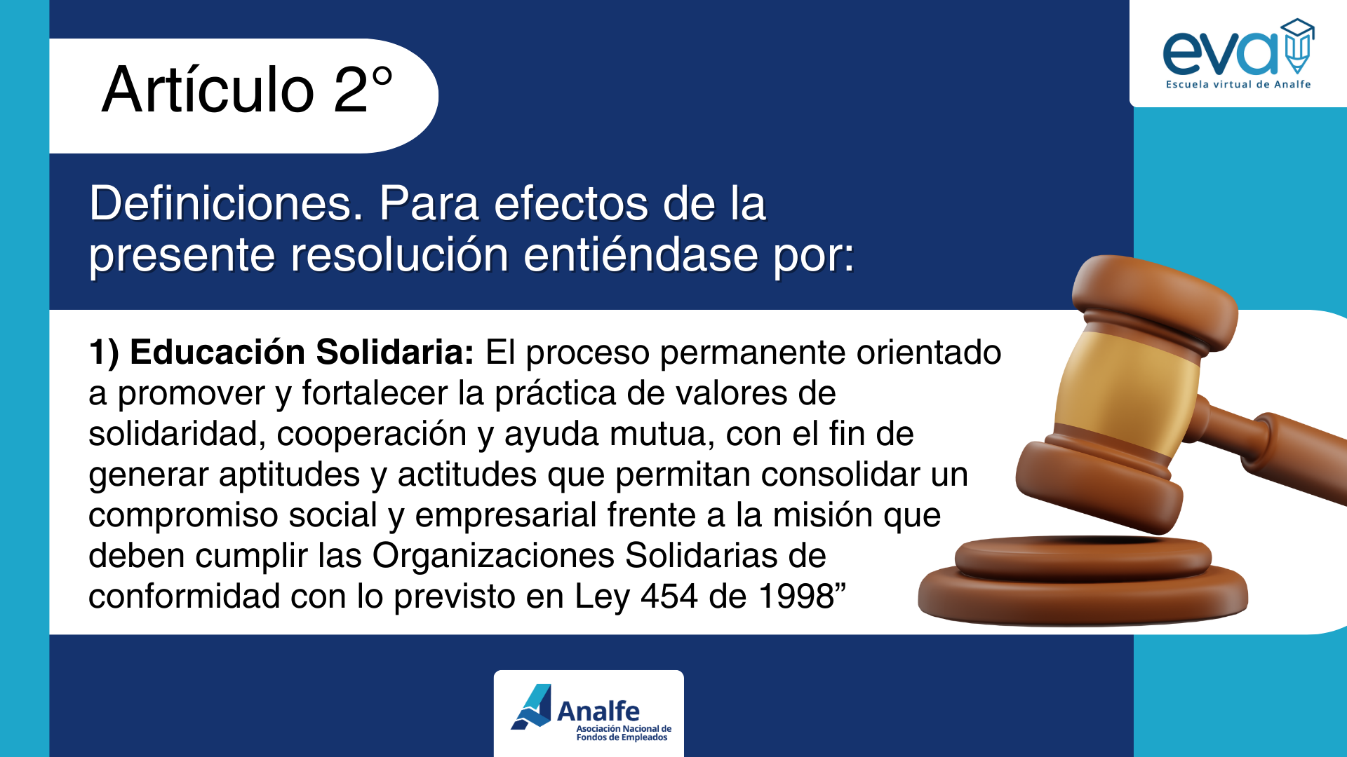 La Unidad Administrativa Especial de Organizaciones Solidarias expidió la Resolución 110 del 31 de marzo de 2016, la cual establece en su artículo segundo, la definición Conceptual sobre la Educación de Solidaria.