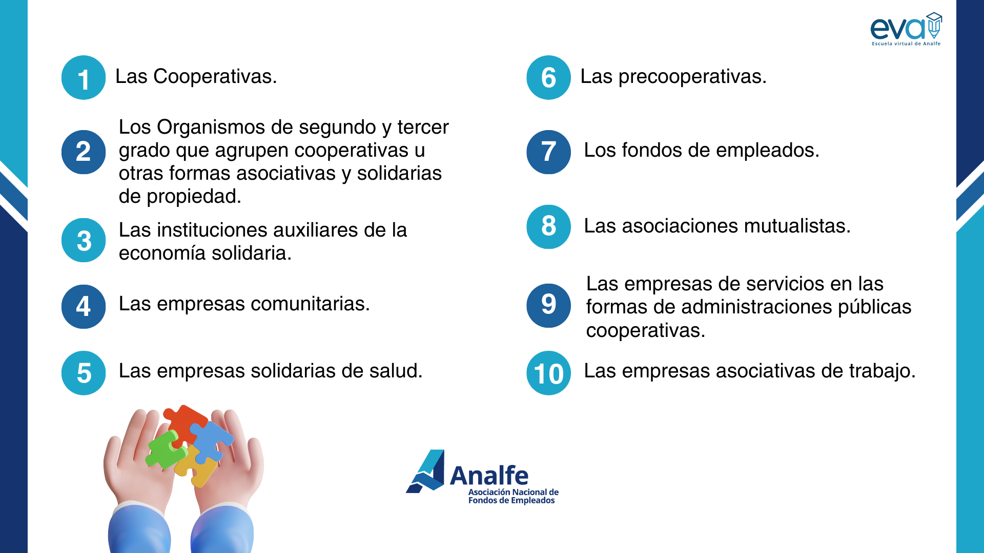 Las organizaciones de la economía solidaria son aquellas que cumplen con las características principios y fines contemplados en la ley 454 de 1998, siendo hoy: