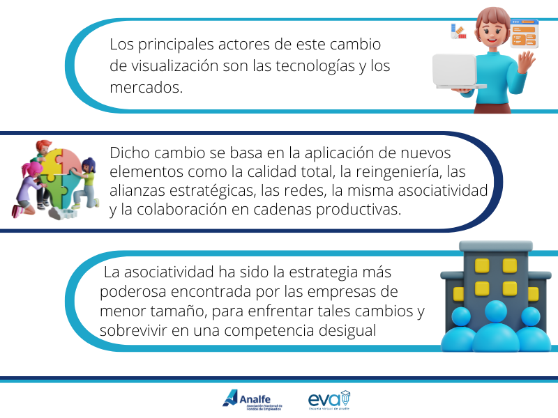 La asociatividad se define como aquella forma de romper con viejos paradigmas en los que se deja de mirar hacia afuera y se esquematiza la interiorización de las empresas como factor de asociación, con el fin de generar variaciones en la producción, organización y comercialización de bienes y servicios.