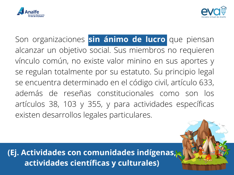 Son organizaciones sin ánimo de lucro conformadas por personas con intereses comunes. No tienen un número máximo de asociados, son de libre adhesión y se regula plenamente por su estatuto.